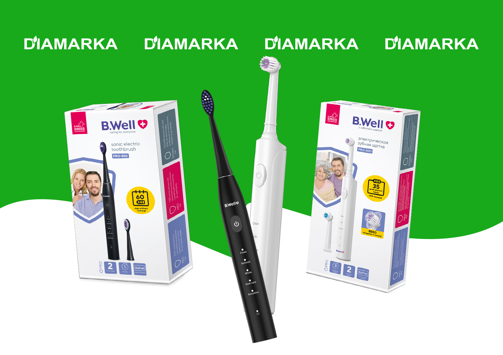 Отличные новости для всех, кто ценит здоровье своих зубов и понимает: домашний уход — это половина успеха! Теперь в ассортименте ДиаМарки появились суперсовременные зубные щетки от мирового бренда B.Well — PRO-800 и PRO-850 (в стильном черном и белом цвете).