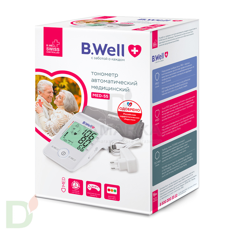 Автоматический тонометр B.Well MED-55 для домашнего контроля давления с режимом 3check и памятью для двух пользователей. Надежный помощник в аптечке, который даст точные результаты быстро и с комфортом. Идеален для всей семьи, диабетиков и пожилых.